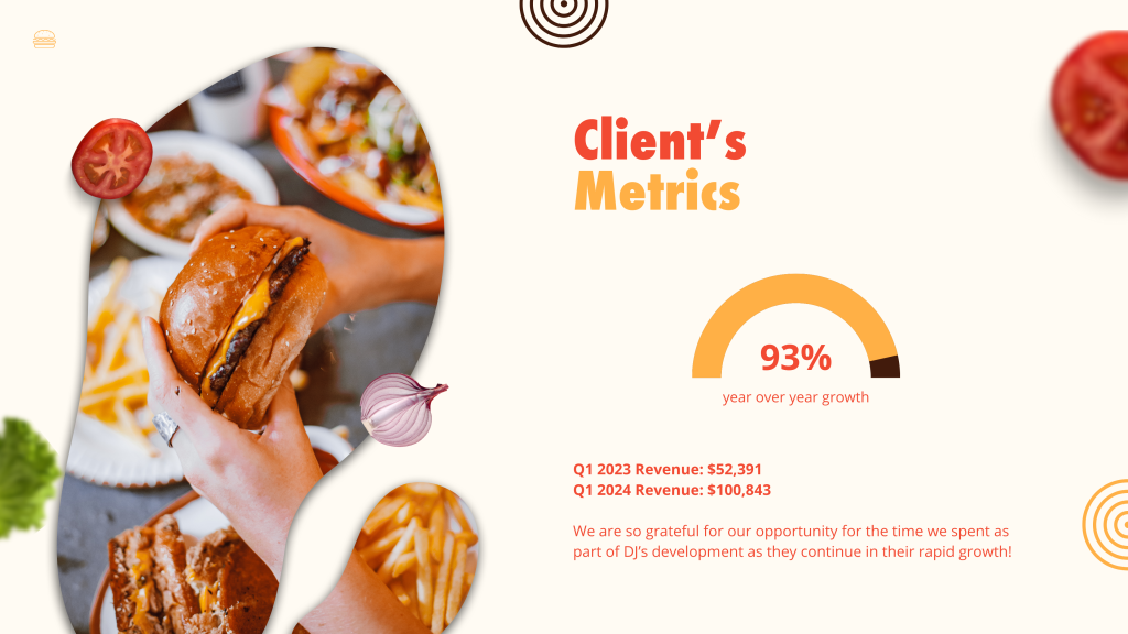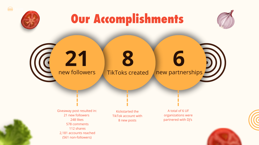 DJ’s Cast Iron Burgers sought to expand its reach among UF students and stand out locally. As strategist and account manager, I developed a digital strategy that launched a TikTok account, reached 2,000 Instagram accounts, and drove 93% year-over-year growth.