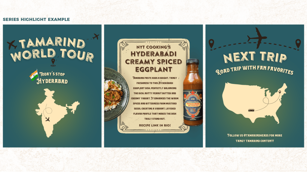 Tamarind Heads strived to increase visibility among audiences with cultural or regional ties to tamarind. During my internship as Social Media Manager, I led the five-month World Tour campaign, featuring tamarind-based recipes from diverse regions. The campaign, alongside my broader content strategy, increased views by 5.3K%, boosted engagement by 250%, and expanded reach to over 18,000 accounts.